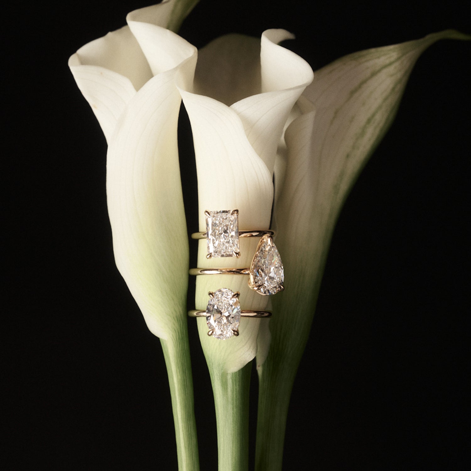 These are fully finished diamond engagement rings that are designed in-house and available to purchase straight away. Every proportion has already been resolved, from the setting to the stone, so what you see is exactly what you receive.