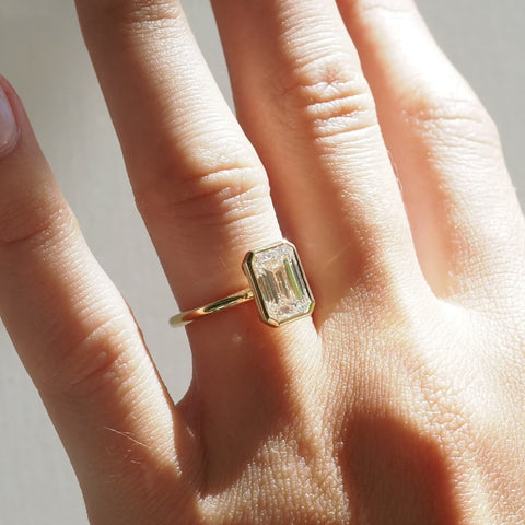 A seamless emerald cut solitaire lab-grown diamond in an open bezel setting—ready to wear