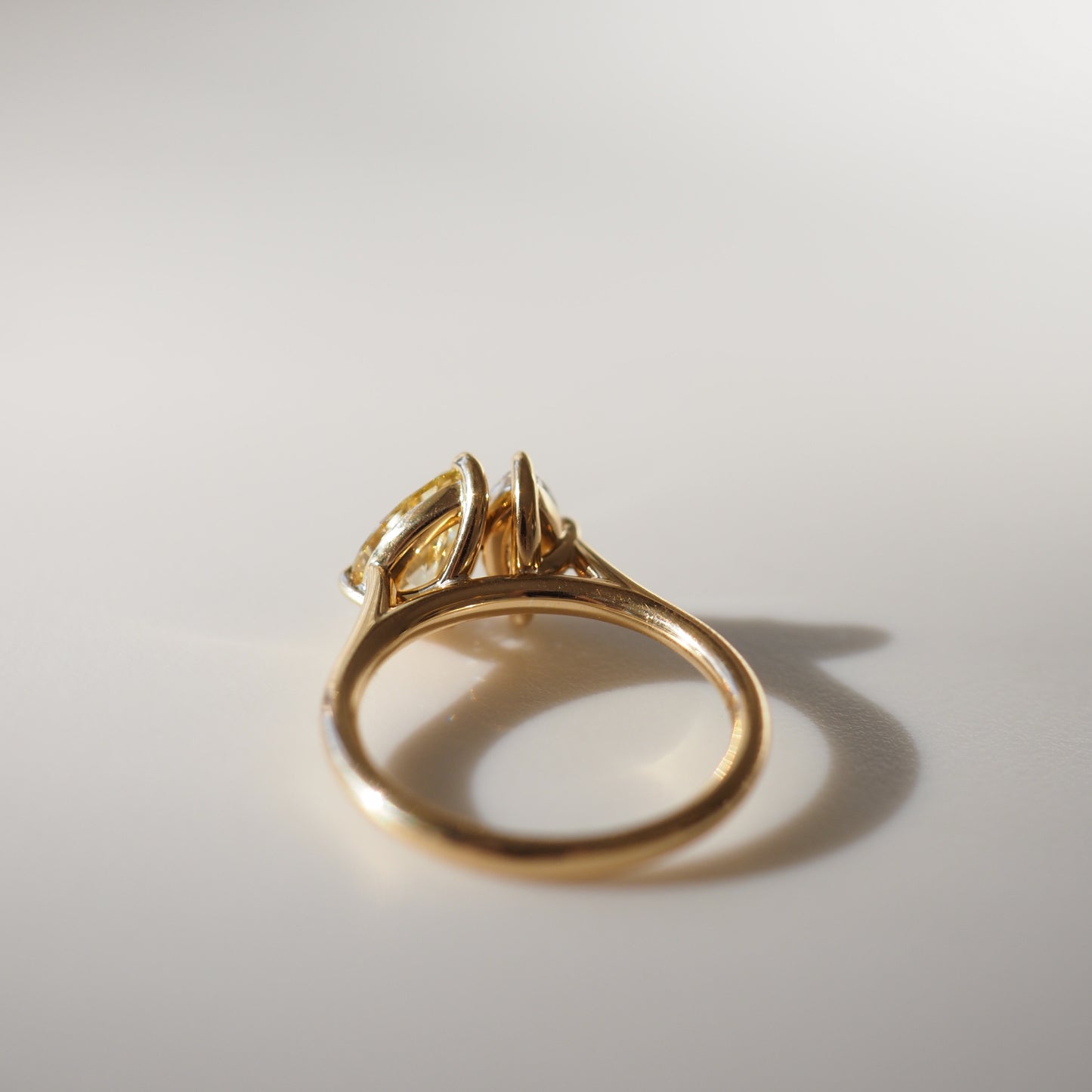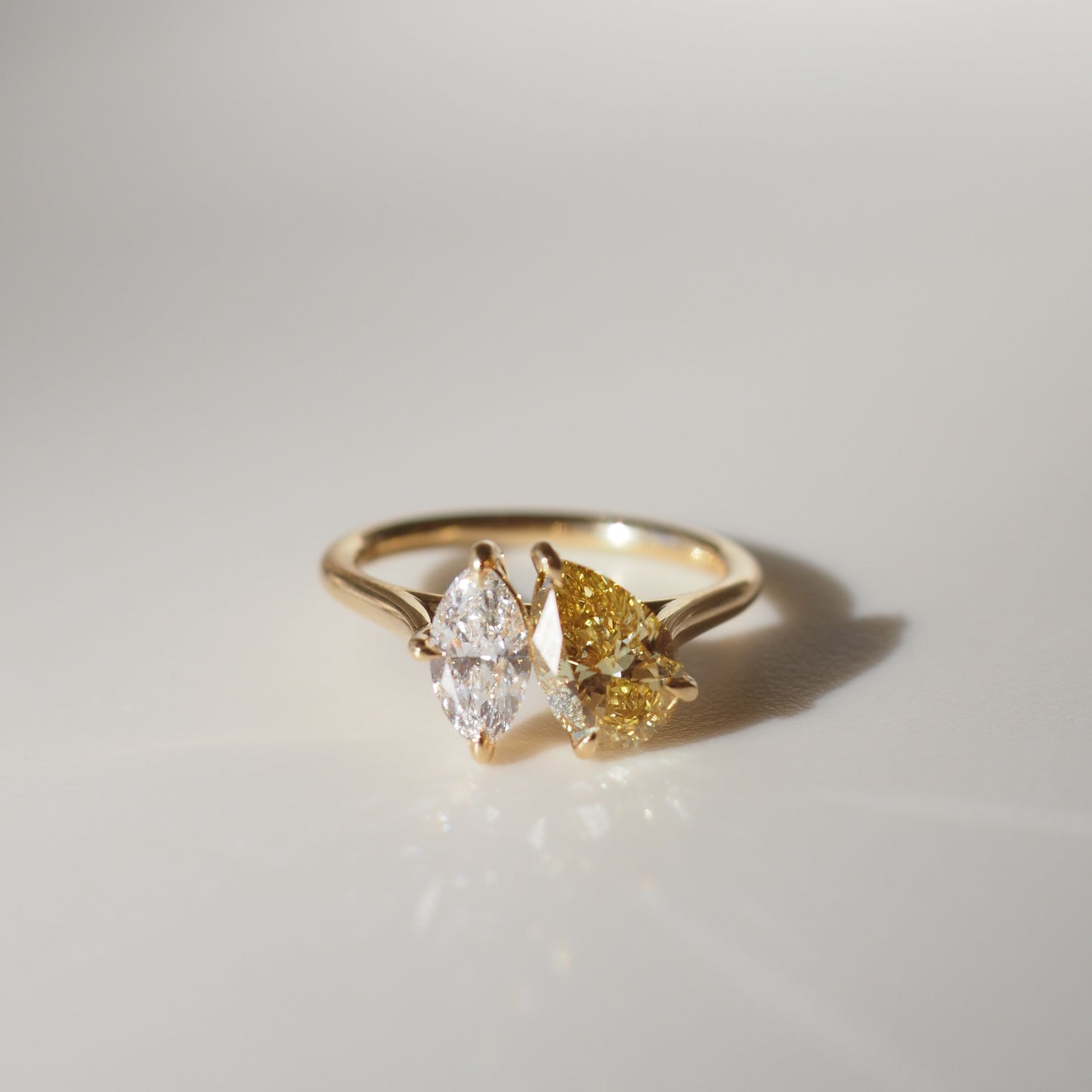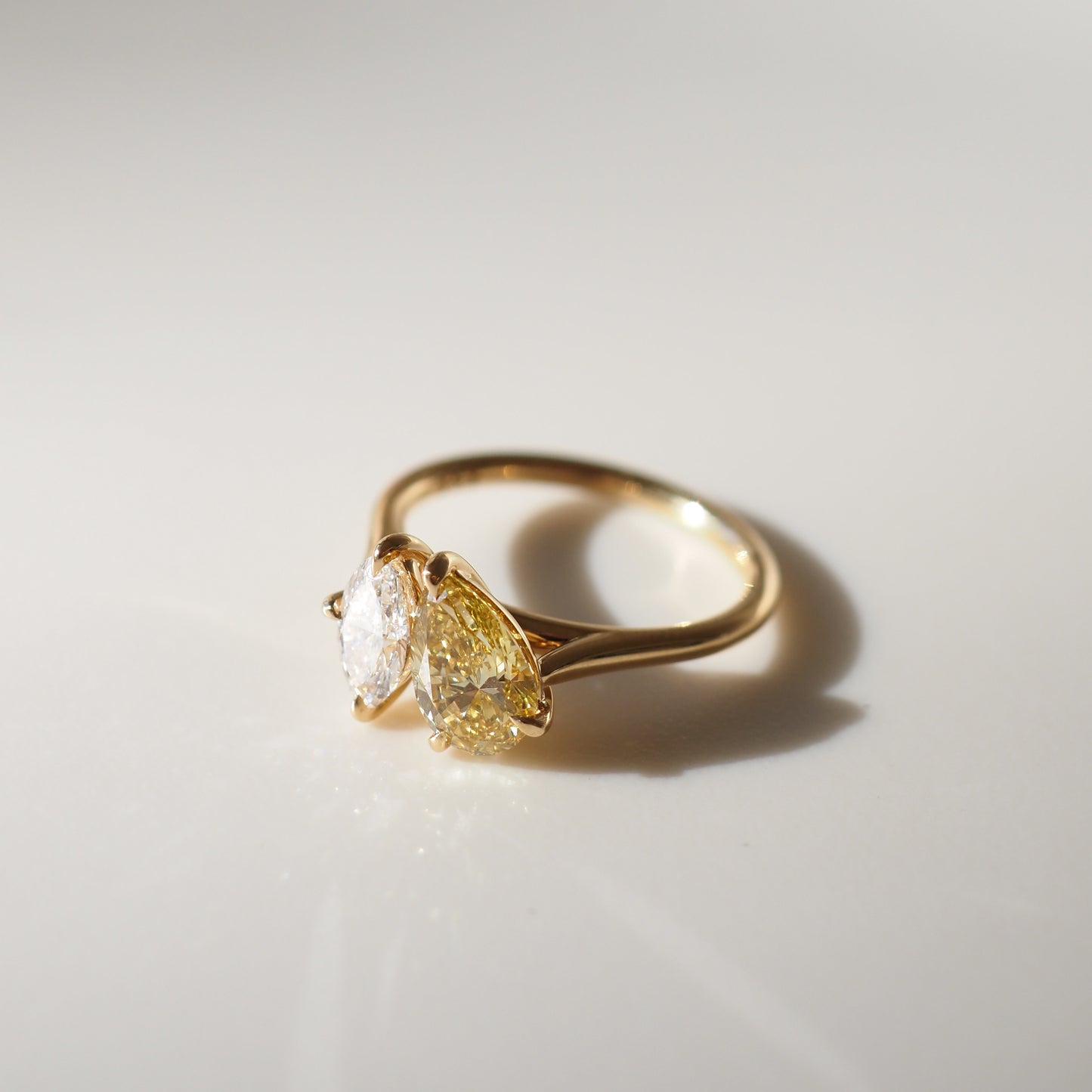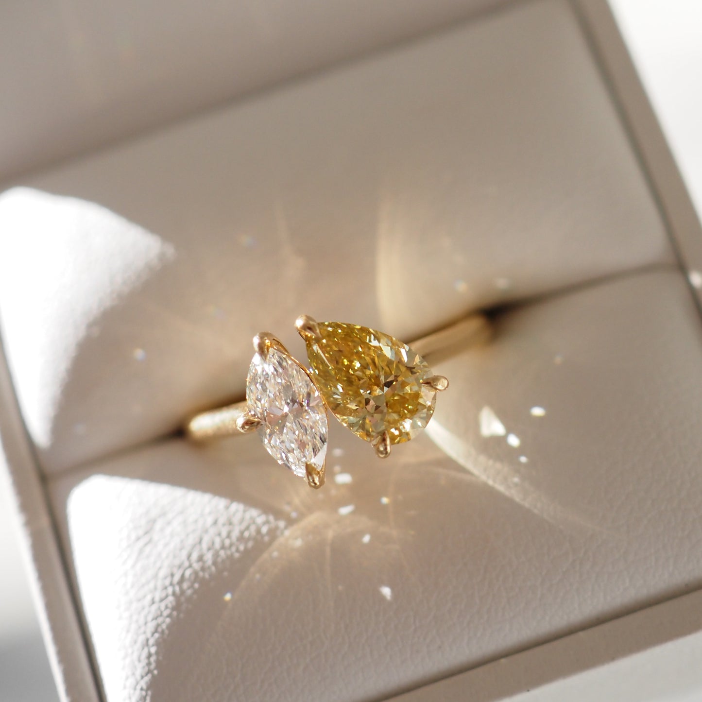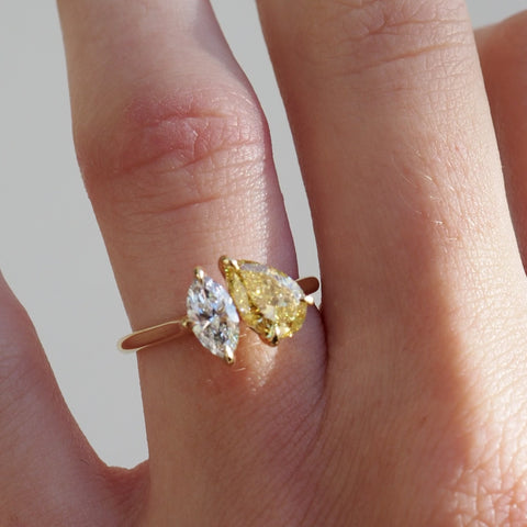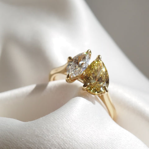 Our Lea Toi et Moi ring features two perfectly proportioned 1.04ct Fancy Yellow Pear & 0.50ct White Marquise lab-grown diamonds.