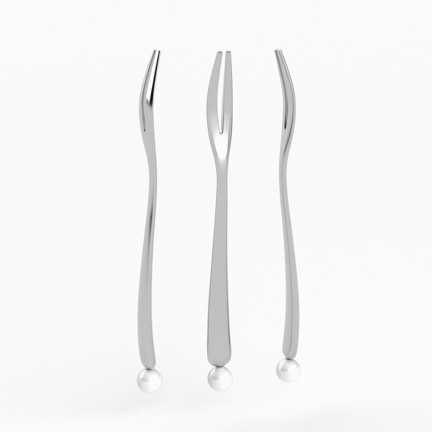 A fine object that transforms the moment—our sculptural oyster fork in solid silver, detailed with a freshwater pearl