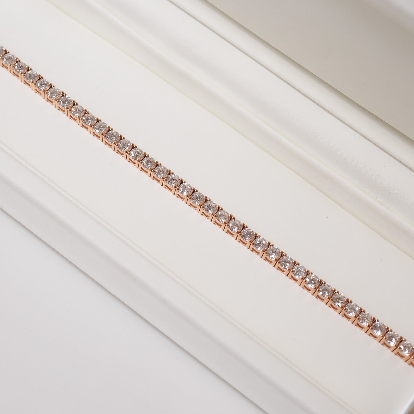 This 18ct rose gold tennis bracelet embodies timeless elegance with 52 lab-grown diamonds totalling 5.56ct. Each 3mm stone is DE colour and VVS clarity, offering luminous brilliance along its 17cm length, finished with a secure box clasp and dual safety latch.